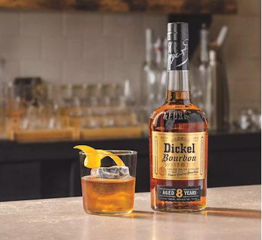Muddle 1 sugar cube with 4 dashes of bitters and a splash of water and add 1.25 oz. of George Dickel Bourbon Whisky Aged 8 Years into a rocks glass with an orange twist garnish for a Dickel Bourbon Old Fashioned.
